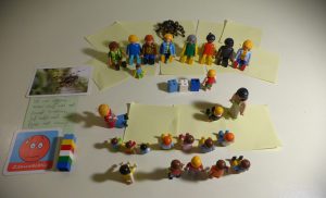 Aline vertelt dat ze al heel erg zenuwachtig was tijdens het oefenen. Ze legt het emotiekaartje ‘zenuwachtig’ bij de opstelling. Hoe zenuwachtig was je, vraag ik. Ze mag het laten zien met legoblokjes. Het worden 6 blokjes en ook die legt ze op tafel.